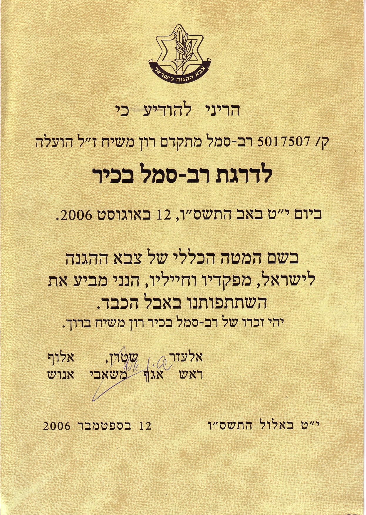 תנחומים למשפחה - לשכת מפקד חיל האויר
